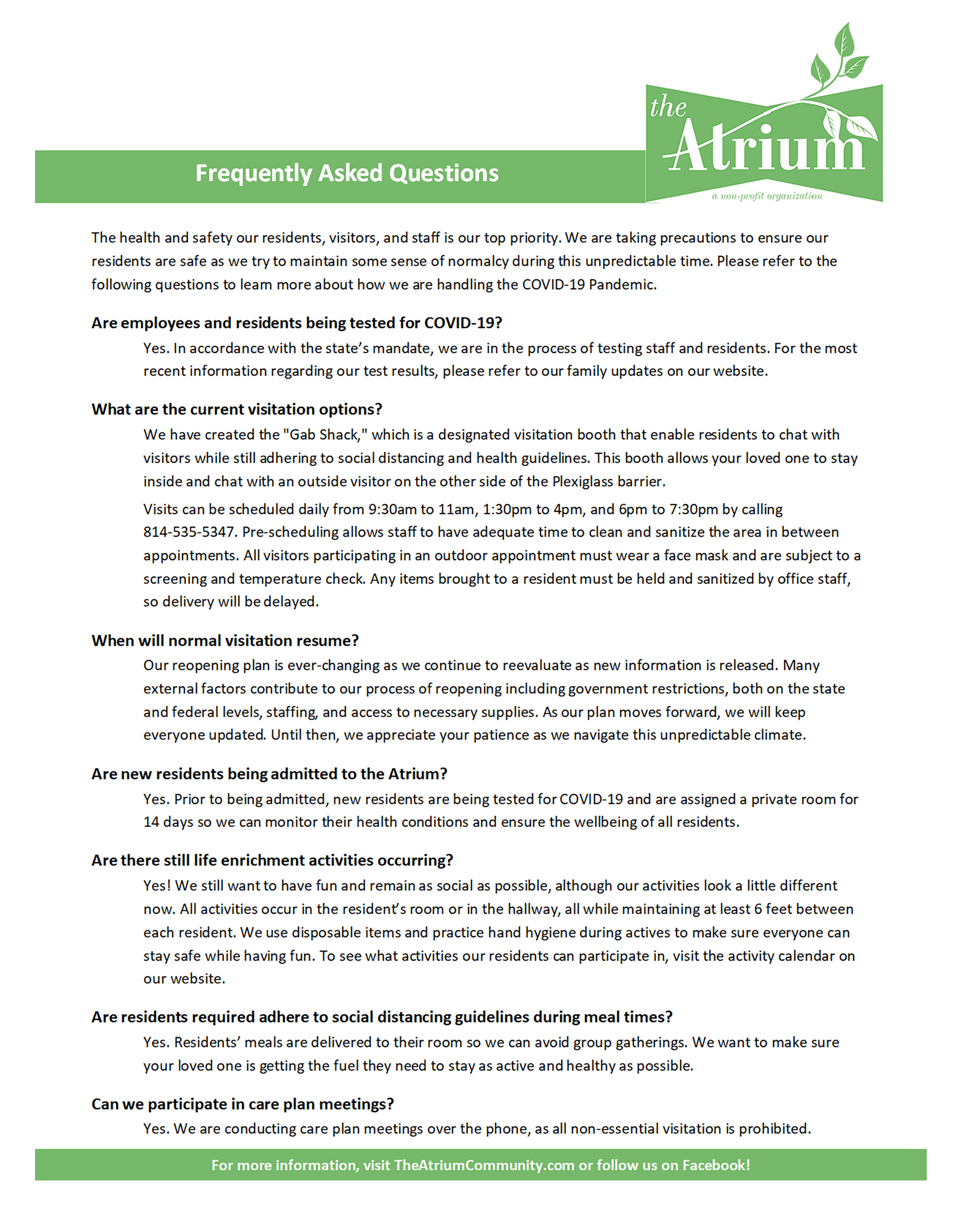 During these times of uncertainty related to the coronavirus, The Atrium is taking every precaution to ensure the safety of our residents and staff during this ever-evolving situation.